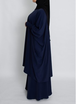 Ein edles Tunika-Set in sanftem Dunkelblau, gefertigt aus feiner Madina-Seide. Die fließende Stoffqualität, gerafften Manschetten und der dezente Reißverschluss verleihen dem Zweiteiler einen femininen, eleganten Charakter. Perfekt für Alltag, Gebet oder besondere Anlässe
