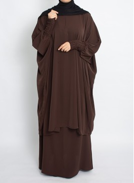Ein edles Tunika-Set in sanftem Braun, gefertigt aus feiner Madina-Seide. Die fließende Stoffqualität, gerafften Manschetten und der dezente Reißverschluss verleihen dem Zweiteiler einen femininen, eleganten Charakter. Perfekt für Alltag, Gebet oder besondere Anlässe
