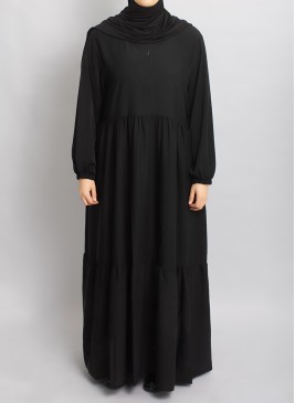 Abaya mit integriertem Stretch-Hijab aus fließendem Jazzstoff – bequem, praktisch und stilvoll für Gebet und Alltag.
